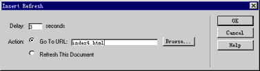 制作一个新的首页作为重定向的页面。用“ head ”对象面板的“ Insert Refresh ”定向到未使用 Flash 技术的网页,如图。它会在页面头部加上如下代码: < meta http-equiv="refresh" content="4;URL=noflash.htm">