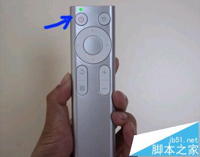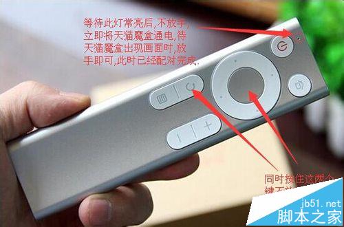 5、待电源键上方的LED灯常亮后,立即将天猫魔盒通电(此时按住遥控器按钮的手不能放,可找人帮忙将其通电)