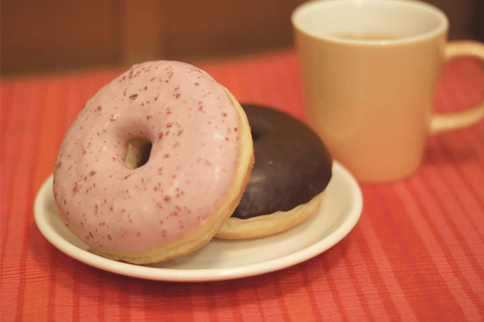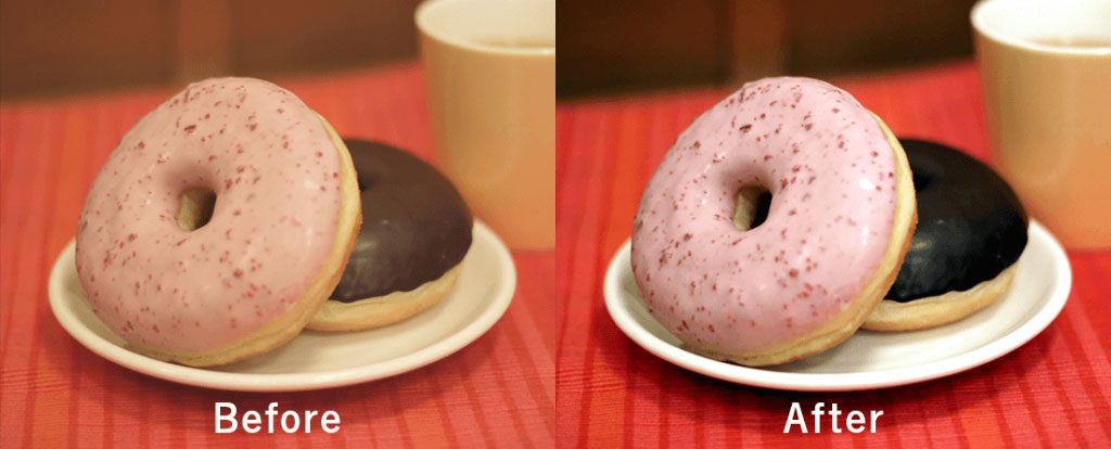 和原图相比,调整颜色后的甜甜圈变得鲜艳美味了许多。