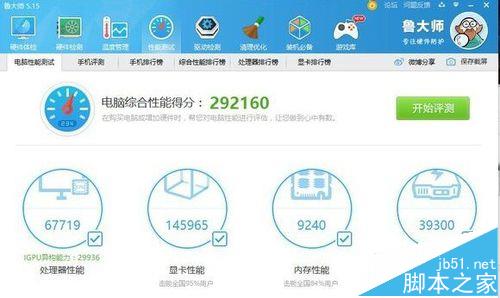 1、我先秀一波鲁大师跑分CPU跑分67719分集成显卡跑分29936(CPU跑分下面有绿色小字部分为集成显卡跑分)GTX1060显卡跑分:145965内存跑分:9240分硬盘跑分:39300分总分含集成显卡:292160分