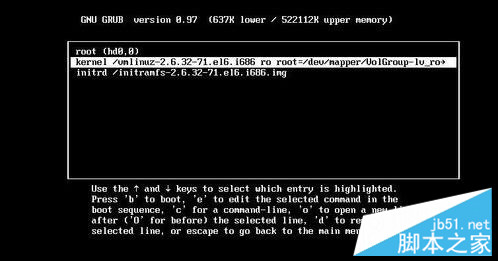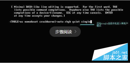 进入如下页面后,通过键盘的上下方向键选择kernel那行,然后再按e进入编辑,在最末尾处加入参数single,使系统开机直接进入单用户模式,然后回车即保存编辑,回到了上一步的界面,点击键盘上的b即启动系统。