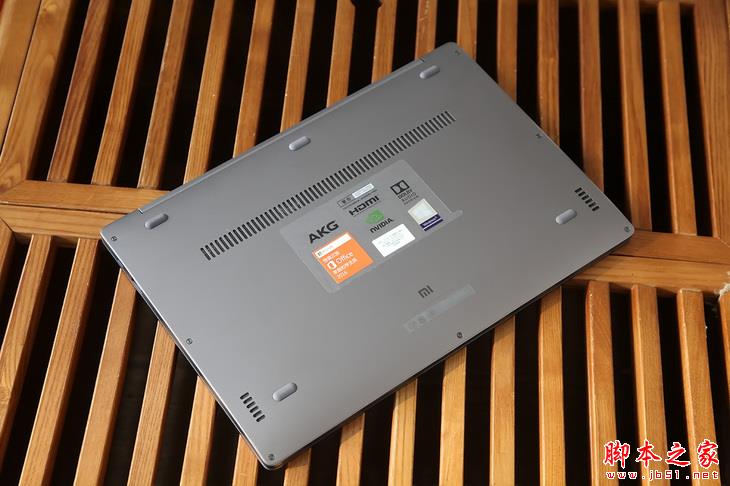 全新小米笔记本Air 13,机身D面的设计沿袭了初代产品的简约,5个橡胶脚垫、一排散热进风孔、底角左右两个AKG定制扬声器以及底部中间的“MI”logo,就是D面的全部元素。
