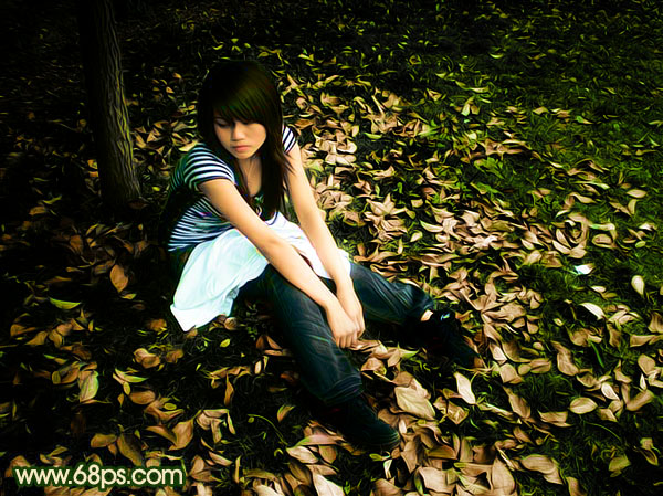 原图素材地面的树叶感觉非常不错,给人一种忧郁深思的感觉。教程调色时候重点在树叶部分,把草地等地方调深处理。更加突出人物和背景。