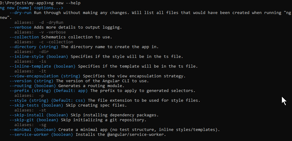 综上, ng new 的这些参数可以在生成项目的时候作为命令的参数联合使用, 其中有一些参数也可以在项目生成以后通过修改angular-cli.json文件来做修改.