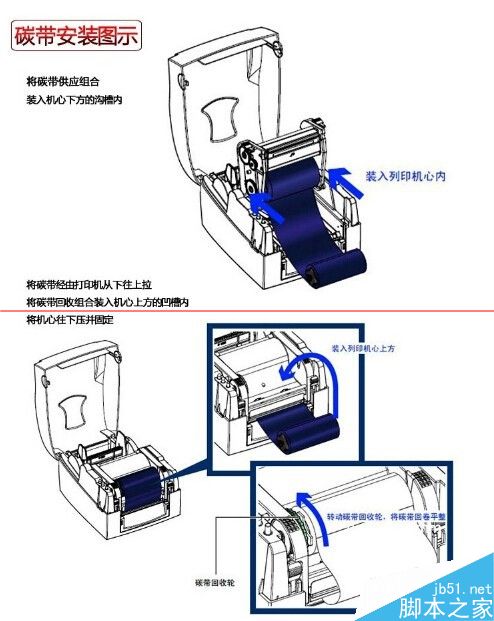 2、取出碳带芯轴和碳带,按照下图所示方向,将碳带芯轴插入碳带轴心中;碳带绕向如下,图所示;