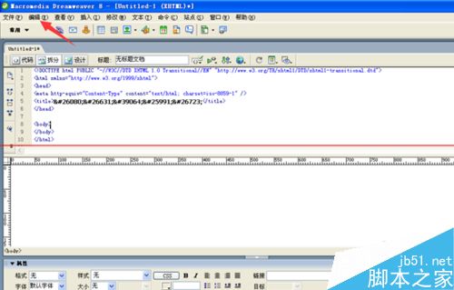 1、运行Dreamweaver程序打开它,进入到Dreamweaver软件的代码编辑窗。