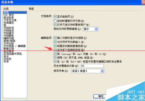 6、进入到首选参数常规项下后, 我们再从常规项的右侧找到“允许多个连续的空格”选项,然后这里点击把它√选,最后点击确定关闭首选参数管理窗。