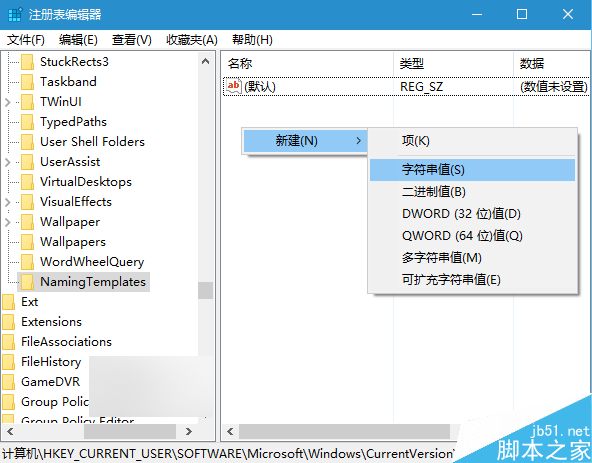 4、点击NamingTemplates,在右边空白处新建字符串值(如下图),命名为RenameNameTemplate
