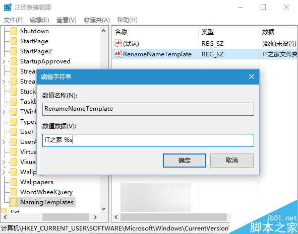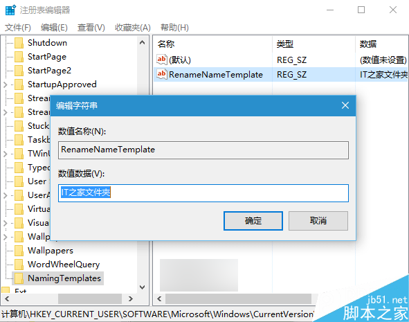 5、双击RenameNameTemplate,在“数值数据”中输入你想要的新建项目临时名称,例如“IT之家文件夹”,如下图——