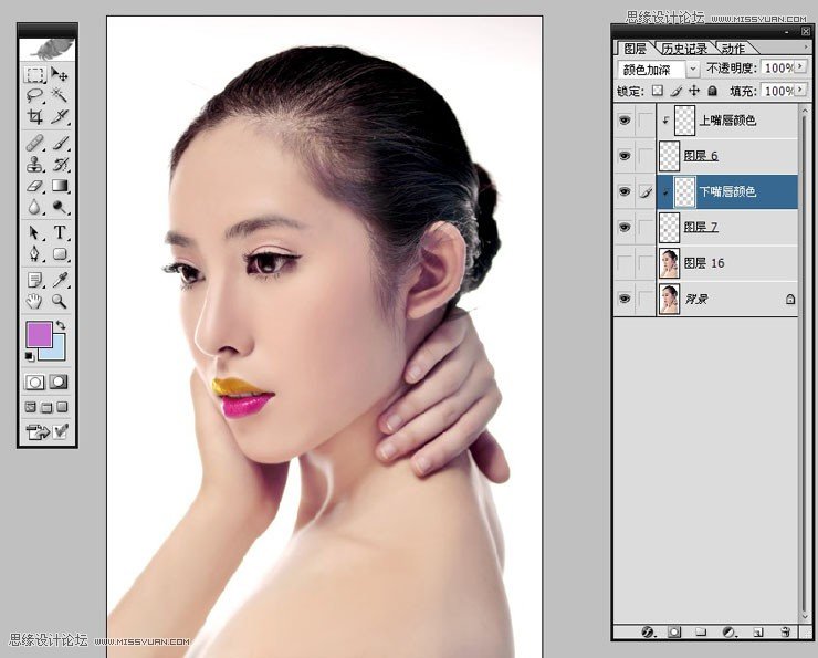 8.把添加出来的黄颜色隐藏到复制出来的上嘴唇中,正常模式调整成颜色加深,这时候呈现出金黄的唇彩色彩干很强。