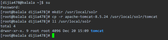 我先切换下root用户啊,然后创建solr目录,将tomcat复制重命名到/usr/local/solr/tomcat