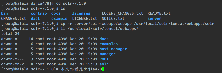 注意,这里因为我用的是solr7.1最新版,所以跟网上很多solr4的版本要拷贝*.war文件,然后再启动tomcat解压的操作是不一样的。(这里直接就是解压好的)