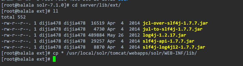 server/lib/ext/下的所有jar复制到 /usr/local/solr/tomcat/webapps/solr/WEB-INF/lib/下,都是些日志相关的jar包