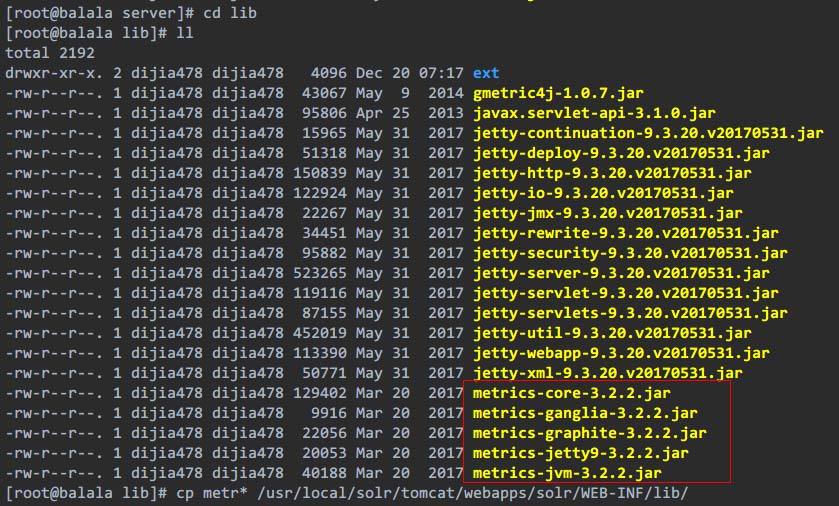 server/lib/metrics* 开头的5个jar复制到 /usr/local/solr/tomcat/webapps/solr/WEB-INF/lib/下(solr4部署没有这个)