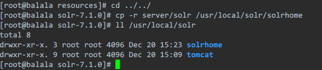 将servier/solr目录复制到之前创建的solr目录下,重命名为solrhome,现在/usr/local/solr目录下就有两个文件夹了