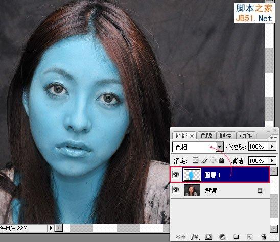 新增一个图层,将图层混合模式设为【色相】,接着利用工具箱 / 笔刷,并将前景设为【青蓝】色,然后直接把脸涂成蓝色。