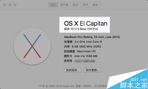 在开始以前,首先请确认当前 Mac 上的系统版本。因为要实现自动隐藏桌面上的菜单栏,需要系统版本为 OS X EL Capitan 版本。如下图所示,在开始前,请先检查 Mac 上当前的系统版本。