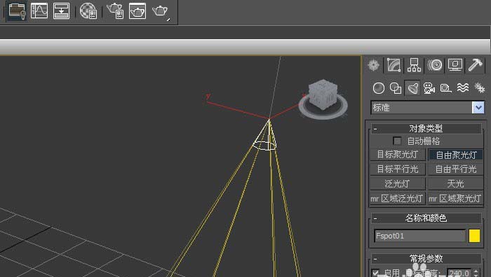 3、在【标准灯光】的面板上,鼠标左键单击【自由聚光灯】,接着在透视图中,拖动绘制自由聚光灯出来,如下图所示。