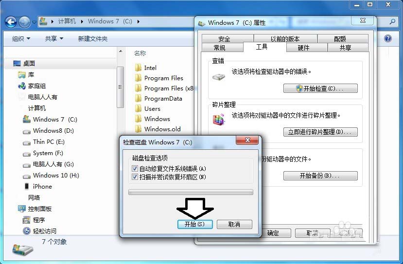 磁盘检查选项:自动修复文件系统错误和扫描尝试恢复坏扇区→开始。