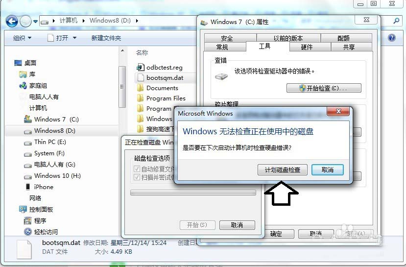 1、非法关机(比如不是从操作系统的开始中正常关机,而是直接拔除电源),系统就有可能会调用操作系统中的磁盘自检,其目的是检测磁盘是否有问题。除了系统自动调用之外,用户也能主动使用该功能,右键点击磁盘(任意磁盘都可以)→属性→工具→差错→开始检查→务必勾选