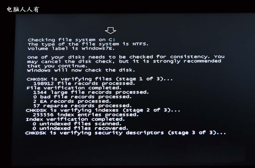 5、然后,重启电脑之后,电脑就会自动调用磁盘自检了,根据磁盘大小,文件多少,这个操作过程通常需要五到十分钟左右。