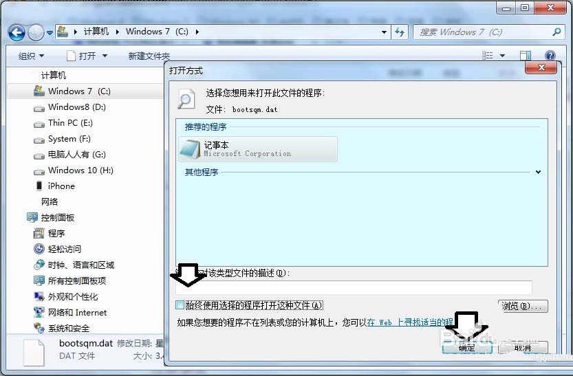 8、选中记事本,并去除:始终使用选择的程序打开这种文件 选中对勾→确定。