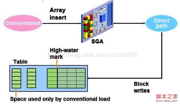 直接路径加载把数据直接插入到要修改的段的高水位(HWM)以上,从而生成了最少量的undo(只生成数据字典的undo,不生成块中数据的undo),且不通过高速缓存(SGA),因此它的性能比常规插入要好。