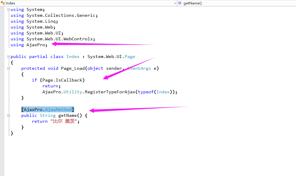 using AjaxPro; //(1) AjaxPro.Utility.RegisterTypeForAjax(typeof(Index)); //(2) [AjaxPro.AjaxMethod] //(3)