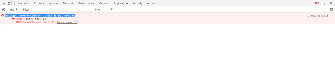 2)还有一点,也是一个错误。这种错误编译时不会出错,加载页面时也不出错。只有调用到 AjaxPro.2 的是时候才报错Uncaught ReferenceError: Index is not defined 当调用后台代码的不起作用时就需要注意是否是这个问题,因为这个报错它不会出现在页面,也不会被编译。想要看到这个错误,必须按 F12 页面调试,我知道Google Chrome 浏览器 的错误显示在 Console 选项卡当中,其他浏览器博主就不是特别清楚了。