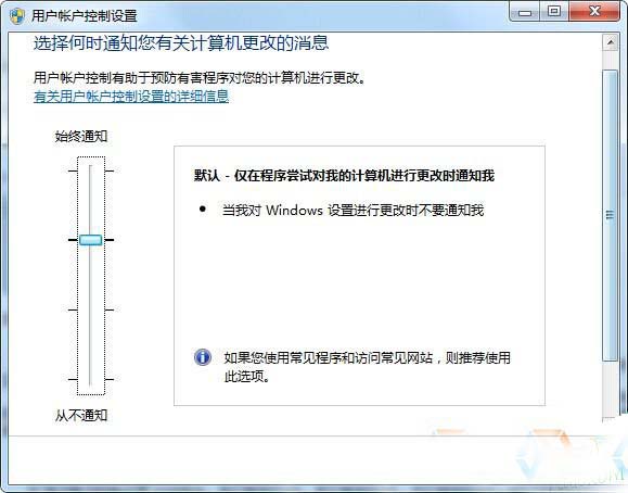 我们可以看到,在用户帐户控制置设中,有三个级别,不同的级别系统对程序的监控是不一样的,具体大家可以参考几每个级别的说明,一般情况下用户选择默认级别的下面一个级别就可以了(仅当程序对计算机设置进行更改的时候提示,一般程序安装运行都不会提示)选择这一项的时候 就算系统提示程序更改计算机设置,屏幕也不会变暗,如果你对系统安全有把握,且安装了杀毒软件,你可以直接关闭UAC(从不通知),这也是很多用户的通用设置方法,选择该项后系统将不再提示任何企图改变系统设置的行为。