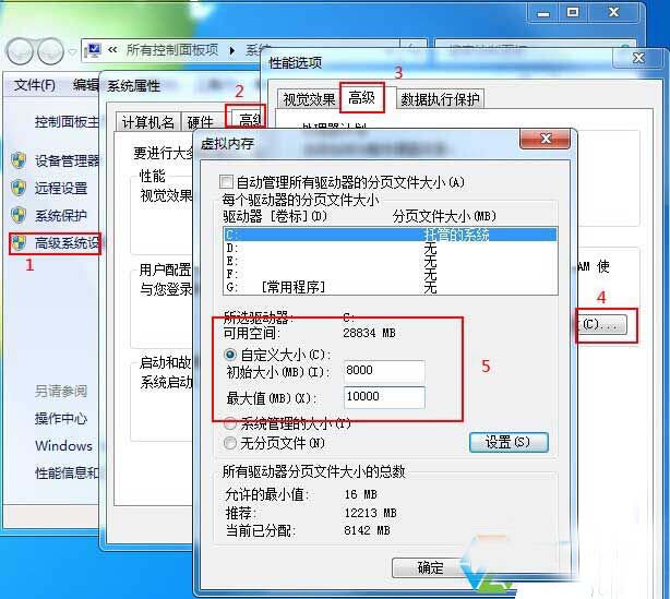 设置方法:计算机——属性——高级系统设置——高级——“性能”设置——高级——更改——自定义大小,如下图