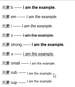 <!DOCTYPE html> <html lang="en"> <head> <meta charset="UTF-8"> <title>Learn4Font</title> </head> <body> <p> 元素 b —— <b> I am the example.</b></p> <p> 元素 em —— <em> I am the example.</em></p> <p> 元素 i —— <i> I am the example.</i></p> <p> 元素 s —— <s> I am the example.</s></p> <p> 元素 strong —— <strong> I am the example.</strong></p> <p> 元素 u —— <u> I am the example.</u></p> <p> 元素 small —— <small> I am the example.</small></p> <p> 元素 sub —— <sub> I am the example.</sub></p> <p> 元素 sup —— <sup> I am the example.</sup></p> </body> </html>