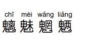 <p style=" font-size: 3em;"> <ruby>魑<rp>(</rp><rt>chī</rt><rp>)</rp></ruby> <ruby>魅<rp>(</rp><rt>mèi</rt><rp>)</rp></ruby> <ruby>魍<rp>(</rp><rt>wǎng</rt><rp>)</rp></ruby> <ruby>魉<rp>(</rp><rt>liǎng</rt><rp>)</rp></ruby> </p>