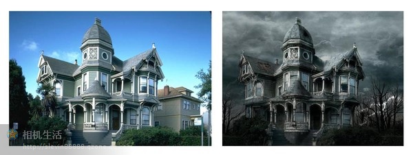 4.将天空放到房子的后面(天空层放到房屋层的下面),并为天空添加一点透视变形效果来增加背景的深度。