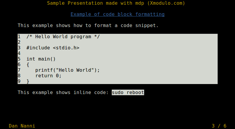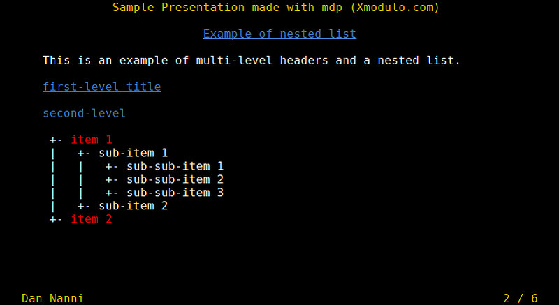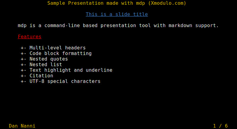 mdp是Linux下一款基于ncurses的命令行演示工具。我喜欢mdp在于它对markdown的支持,使得我很容易以熟悉的markdown格式来创建幻灯片。自然,它还可以很轻松地用HTML格式来发布幻灯片。另一个好处是它支持UTF-8字符编码,这让非英语字符(如希腊或西里尔字母)的展示也变得很方便。
