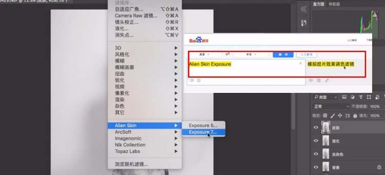 8、这里回到PS,在皮肤图层上,选择插件【EXPOSURE7】。