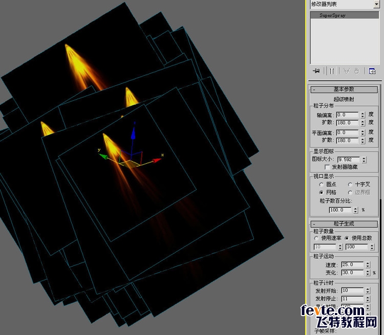 我们建个SuperSpray(超级喷射)粒子发射器,轴偏离和平面偏离都给180度,让粒子呈一个球面的放射效果: