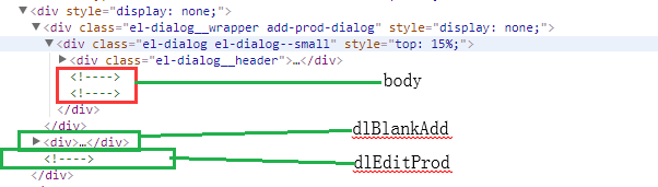 products.vue引入dlAddProd弹框(dlAddProd.vue),由于<div v-show="visible">,所以在products页面加载时,dlAddProd会被加载。但是el-dialog中的body部分不会被加载(不管有没有加v-if指令);dlAddProd弹框中又引入了dlBlankAdd弹框和dlEditProd弹框,但此时只有dlBlankAdd会被加载,dlEditProd不会被加载(<div v-if="visible">);