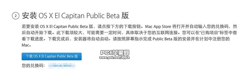 4、苹果会提示你先备份好现有系统的内容,尤其是重要文件资料,这里PC6苹果网小编再一次提醒各位Mac用户,工作用机不建议现在升级。我们在第2步可以看到蓝色按钮“下载OS X Yosemite Public Beta 版”,并且有一串蓝色 字体的兑换码,记住它。