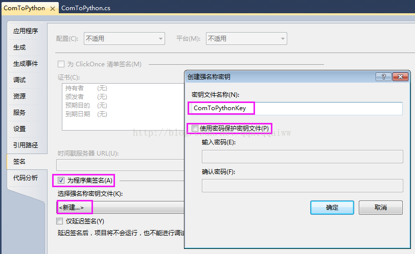 新建签名ComToPythonKey,取消勾选 “使用密码保护密钥文件”
