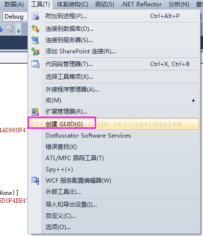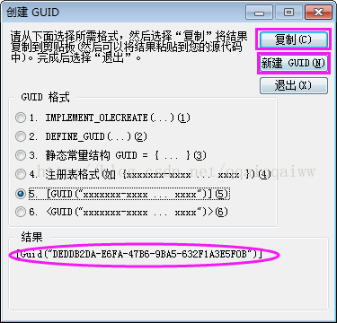 GUID使用VS2010自带工具生成,工具--创建GUID,点击复制两个GUID分别放至两个类名之前