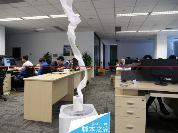 把圈纸吹飞1米多高也毫无压力,在旋转风道的压力下,纸巾自己卷起来了……这个时候,下方的进气网孔甚至可以吸起附近十几厘米的纸屑。