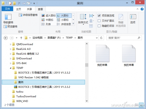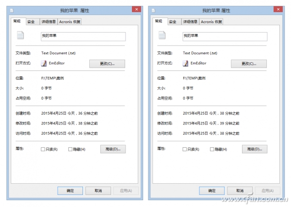 如图1所示,在同一个文件夹中出现了两个一模一样的“我的苹果”文本文件(图1)。通过查看其文件扩展名,发现文件类型均为标准的TXT类型,并没有任何文件格式方面的“猫腻”(图2)。