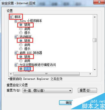 本方法以IE浏览器为例子,打开IE浏览器链接到需要访问的网页中。点击IE浏览器的“工具”—“Internet选项”菜单,切换到“安全”标签页,选择“自定义级别”,将所有脚本全部禁用。如下图操作:
