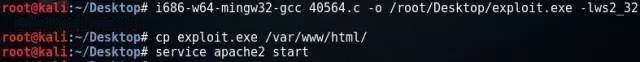 要将漏洞利用程序转移到目标主机,我们将使用内置的ApacheWeb服务器来提供它。 最后2个命令会将exploit复制到Apache主目录并启动Apache Web服务器。