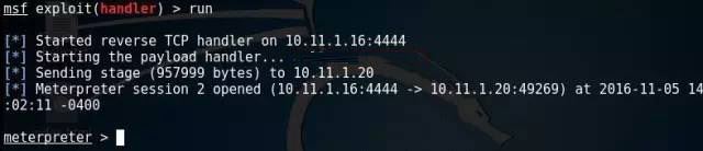 然后下载利用程序到目标主机并执行它。 如果一切设置正确,您应该在msfconsole上收到一个反向Meterpreter shell: