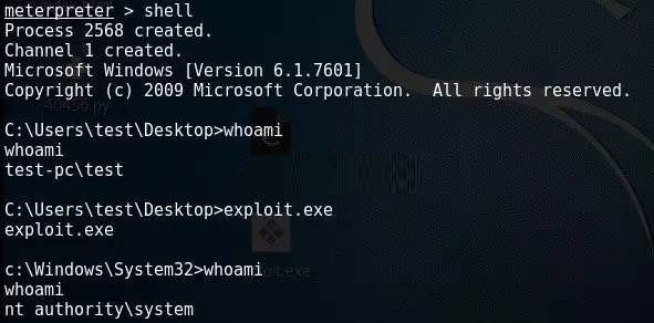 我们已成功的在目标主机上执行已编译的可执行文件,并将shell从有限的用户shell升级到系统shell。 我们已经知道,这个特殊的exploit在shell中生成了一个shell,在这个shell中执行了exploit。 这样,我们还可以从命令行(例如Meterpreter shell)执行特权提升漏洞利用。