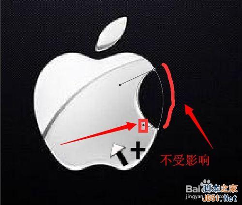 3、再次单击苹果缺口的上边界点 并拖动鼠标 但无论怎么拖动 最多只能让苹果缺口左上部边界与路径弧线重合 尽力调节到最佳位置 然后松开鼠标