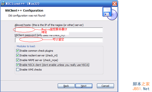 访问http://nsclient.org/nscp/下载NSClient++,这里我使用的是NSClient++-0.3.9-x64的msi安装包。下载之后直接安装,过程中会提示输入Nagios监控服务器地址和密码。地址填写正确,密码不用设置。Nagios监控服务器事先在监控Linux服务器时候已经搭建好,以后再和大家分享。