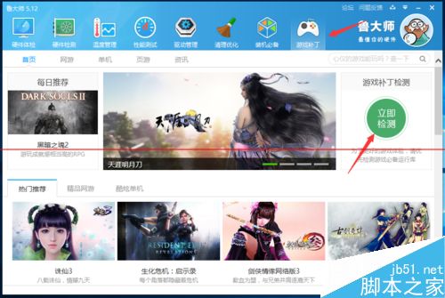 2、已经使用win10系统的想玩LOL要先装鲁大师点顶排右边的游戏补丁进行检测。